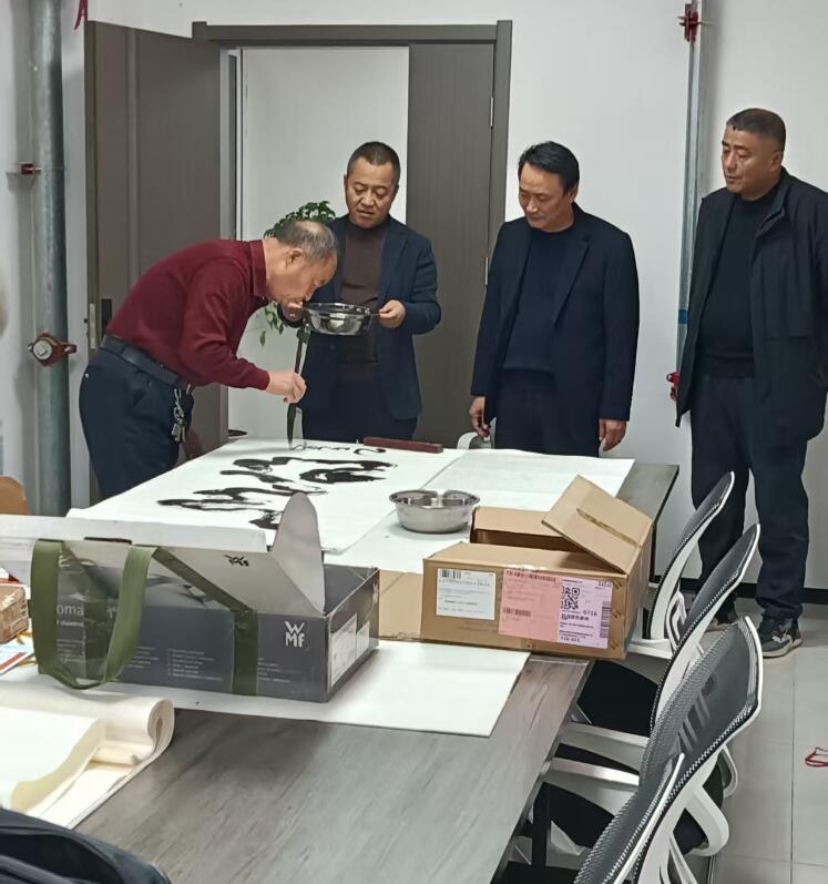 在挥洒墨宝的时刻,雷延军董事长恭敬肃立,全神贯注地将墨盆稳端,以示对老师、对万物、对高维能量磁场的敬重,王存才老师一气呵成,一幅幅能量书法跃然纸上,引得众人阵阵喝彩,就连工作人员大美女都受喜庆氛围的感染,接过雷延军董事长的墨盆一直跟随王存才老师书写的过程,热情为王老师服务,让高维能量磁场的碰撞在颐仁堂中医馆会客厅火花四溢。