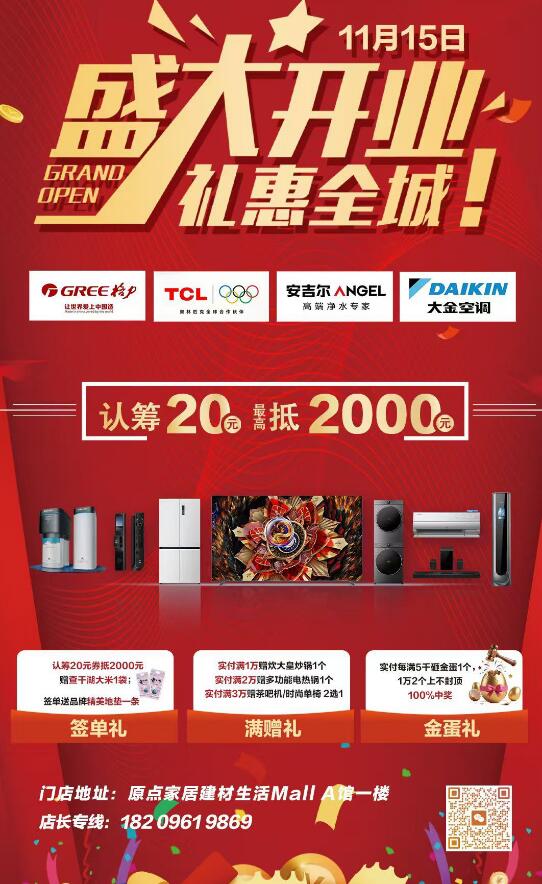 2025年11月15日,座落在原点建材家居综合馆一层东面的“京东家电专卖店”盛大开业。厂家助力,百万补贴,开业大酬宾,畅享狂欢购。该店的亮相不仅填补了区域大型家电家居折扣业态的空白,更将通过 “线上全品 + 线下低价 + 极速服务” 模式,为市民带来看得见的实惠。11月15日原点家居建材生活MALL A馆1楼: 格力电器旗舰店、TCL智慧生活馆、安吉尔净水、大金空调四店同庆,优惠多多!